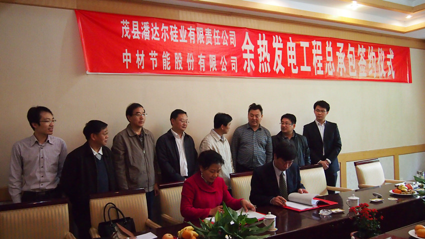 2013年5月6日,中材節(jié)能股份有限公司與茂縣潘達爾硅業(yè)有限責任公司12MW余熱發(fā)電工程總承包合同簽約儀式在四川省阿壩州茂縣舉行。簽約儀式上,潘達爾硅業(yè)董事長陳曉燕女士與中材節(jié)能董事長張奇先生分別代表雙方在總承包合同上簽字。阿壩州州委副書記谷運龍、茂縣縣委副書記周啟軍、副縣長余峰、潘達爾硅業(yè)副總經(jīng)理朱小剛、林坤義、董事長助理熊曉清、總經(jīng)理助理胡景峻,中材節(jié)能副總裁葛立武、市場三部部長唐咸喜、市場經(jīng)理劉志斌等共同見證了這一時刻。