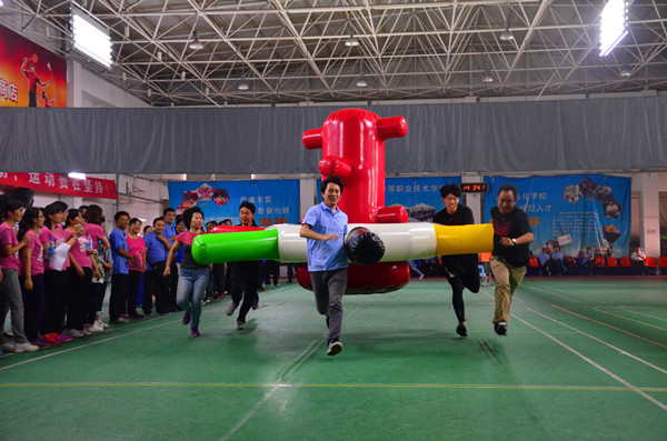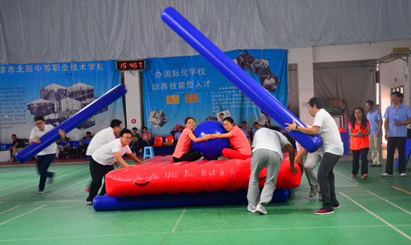 比賽高潮一浪高過一浪。車輪滾滾項目比賽把賽事推向了最高潮,該項比賽不僅拼速度,拼協(xié)作,還要拼認(rèn)真細(xì)致。2人坐在氣墊上面保護(hù)氣球不掉下去,4人往前推氣墊前行,2人還要不停的抽換柱子(相當(dāng)于車輪),如果配合不好,要么氣墊著地,要么車輪變換不及,要么氣球會掉下氣墊。最終技巧與配合默契的設(shè)計二隊獲得該項比賽的第一名。